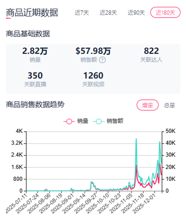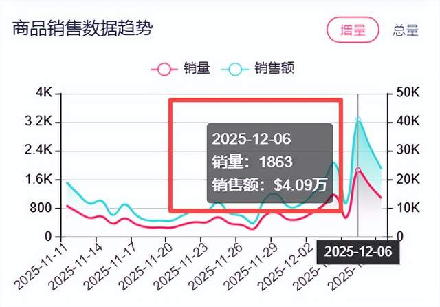 后台数据印证了节日消费的强劲势头,该产品在今年7月份上架后一直岌岌无名,可一踏入11月年底旺季周期,就被早早筹备圣诞好物的消费者一眼相中,热度瞬间攀升。