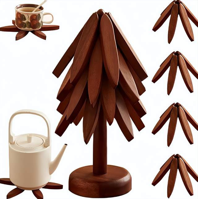 有意思的是,把4个收紧状态的木制隔热垫用支架串在一起后,它们就会拼合成一棵圣诞树的造型,隔热垫化作层层枝叶,木制支架则充当主干。兼顾美观性和便捷性,同时有效节省桌面空间。